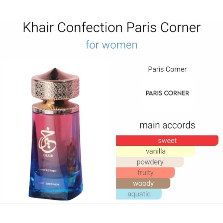 • Khair Confection by Paris Corner is a floral fruity gourmand fragrance launched in 2024, loved for its dessert-like sweetness and soft elegance.