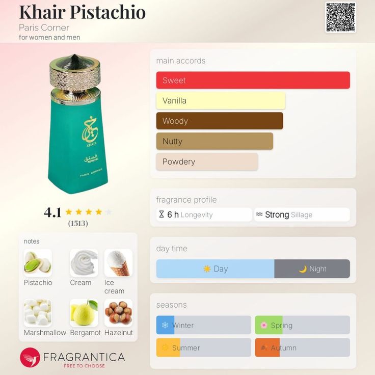 - Khair Pistachio by Paris Corner is a floral fruity gourmand fragrance launched in 2023, known for its dessert-like sweetness.