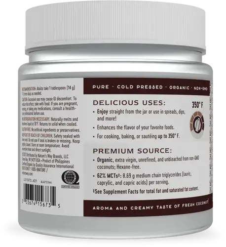 Imagine immersing yourself in the essence of the tropics with Nature's Way Organic Extra Virgin Coconut Oil. Sourced from the highest quality, non-GMO coconuts, this exquisite oil is meticulously cold-pressed to preserve its natural integrity, ensuring you receive the unadulterated benefits of its unrefined, unbleached, and hexane-free composition. Each jar encapsulates the rich aroma and subtle, sweet flavor of fresh coconuts, transporting your senses to a serene island paradise.